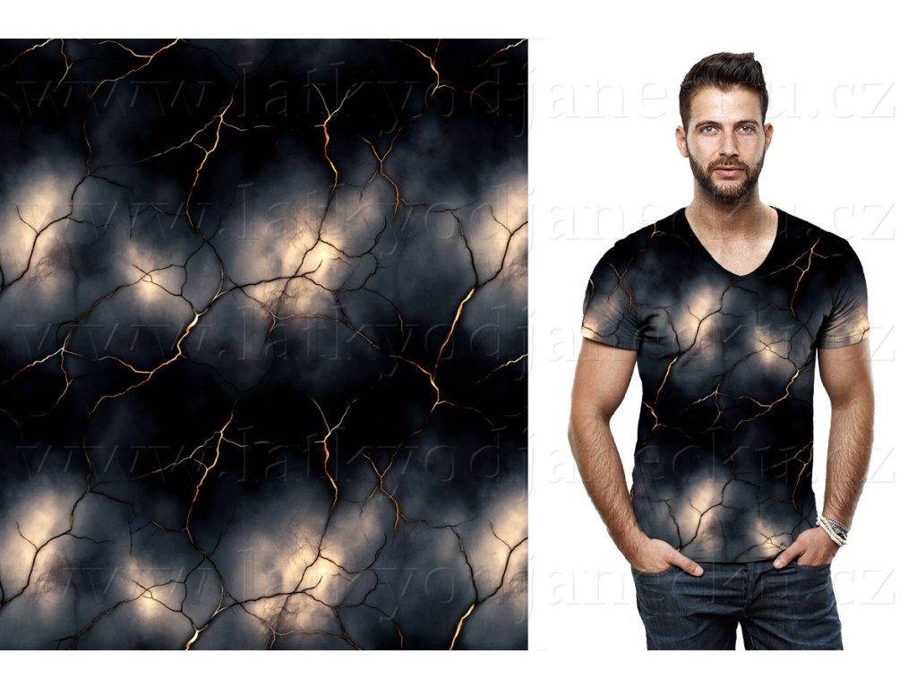 Panel z bavlněného úpletu s motivem zlatých puklin na temném pozadí vytváří na oděvu moderní a dramatický efekt. Vzor dodává oděvu originalitu a sofistikovaný vzhled. Ideální pro muže, kteří se nebojí experimentovat se stylem.
