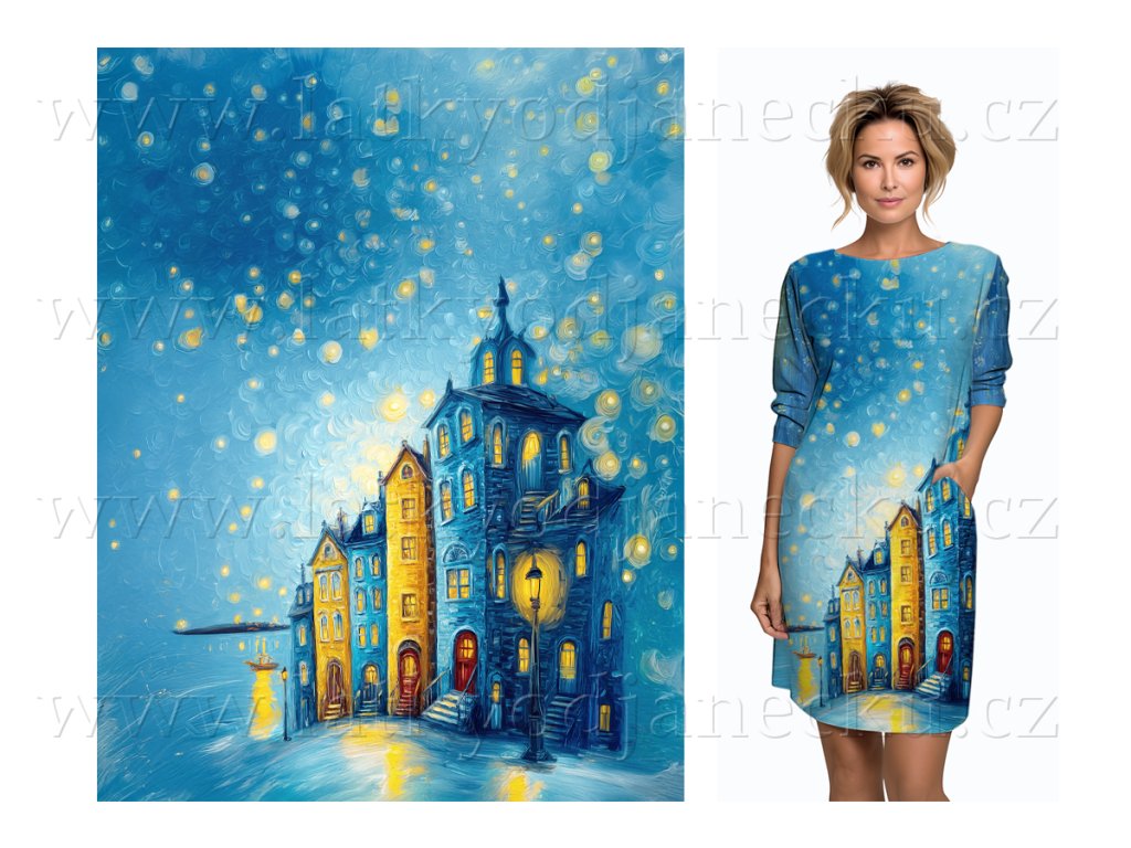SKLADEM 11/2 - Bavlněný úplet 200g - PANEL na přední díl tuniky XL 100 cm - Žlutomodrá, domky