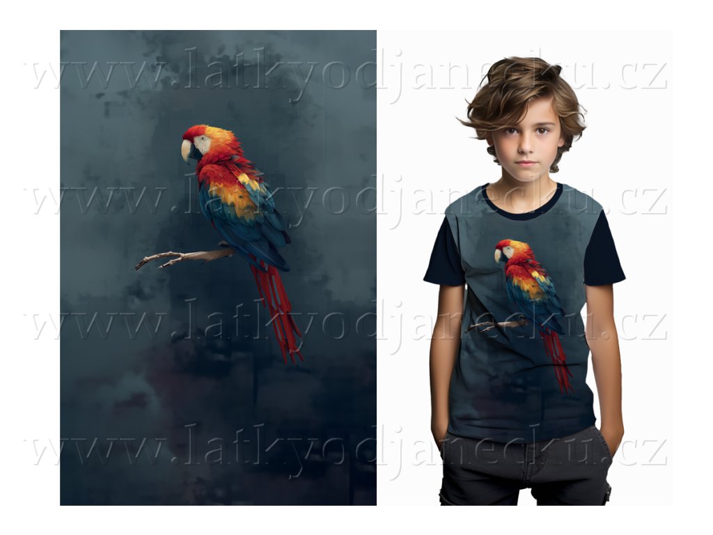 SKLADEM 11/3 - Bavlněný úplet - PANEL na přední díl trička pro děti M - Papoušek na šedé