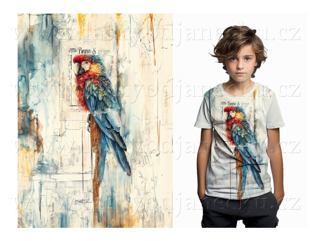SKLADEM 11/3 - Bavlněný úplet - PANEL na přední díl trička pro děti M - Papoušek na textu