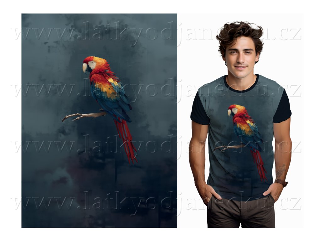 SKLADEM 11/3 - Bavlněný úplet - PANEL na přední díl trička pro náctileté L - Papoušek na šedé