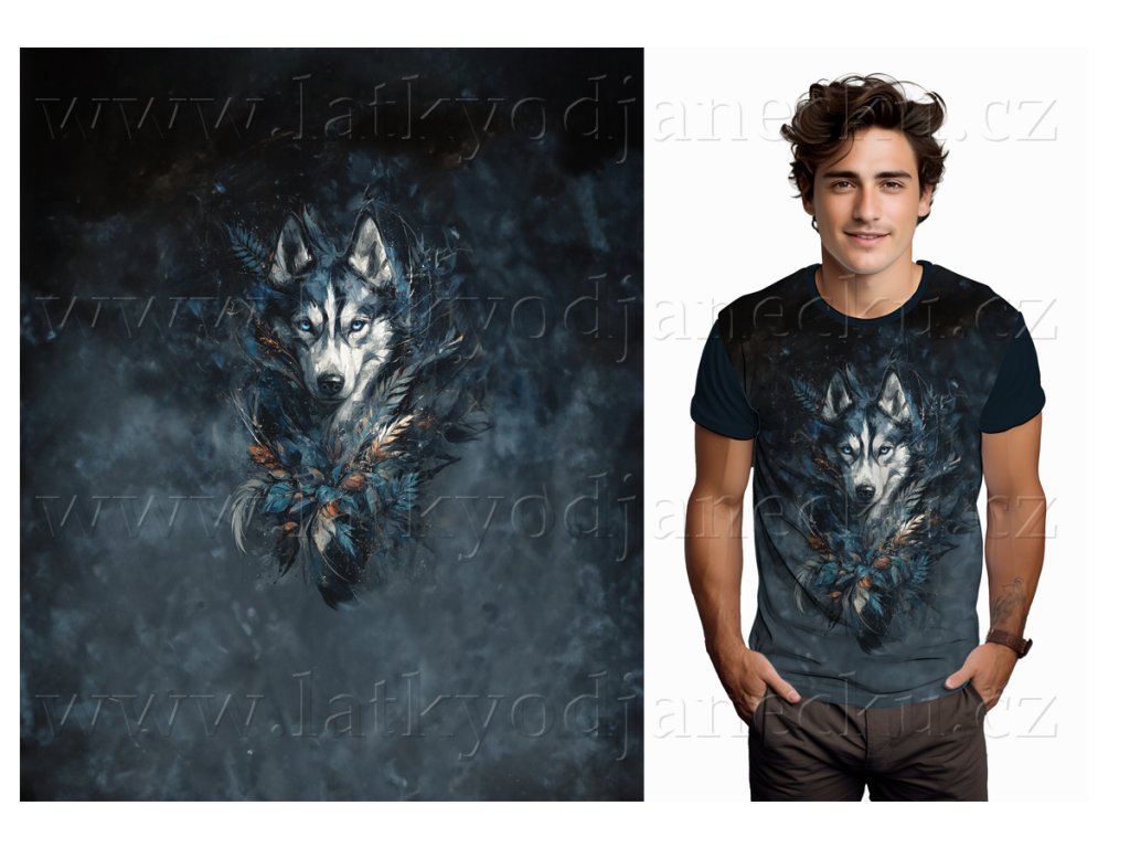 SKLADEM 11/3 - Bavlněný úplet - PANEL na přední díl trička pro náctileté L - Vlk s peřím