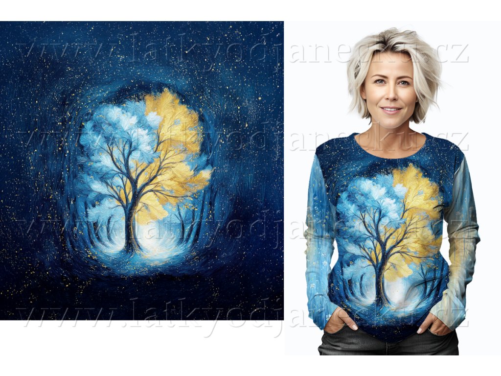 SKLADEM 11/2 - Bavlněný úplet - PANEL na přední díl trička XL 80 cm - Žlutomodrá, strom