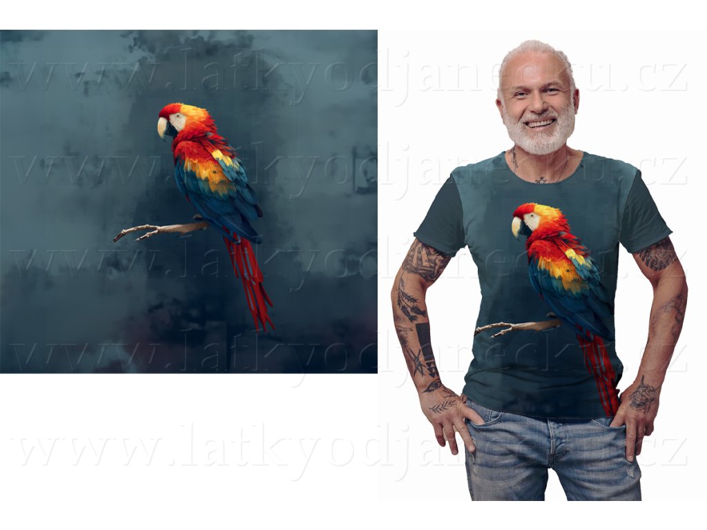 SKLADEM 11/3 - Bavlněný úplet - PANEL na přední díl trička XL 80 cm - Papoušek na šedé