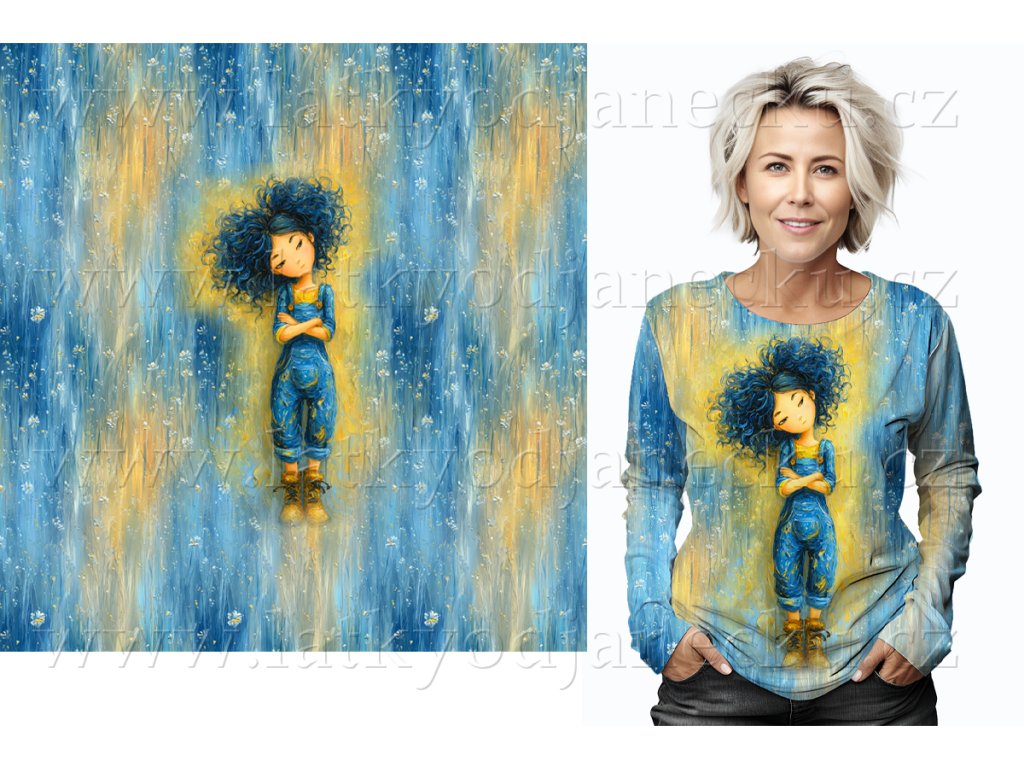 SKLADEM 11/2 - Bavlněný úplet - PANEL na přední díl trička XL 80 cm - Žlutomodrá, modré vlasy