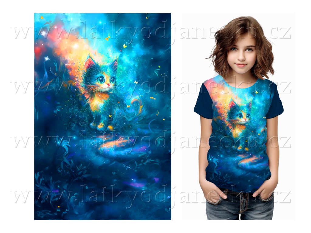 SKLADEM 11/1 - Bavlněný úplet PANEL na tričko M - Kočička na modré