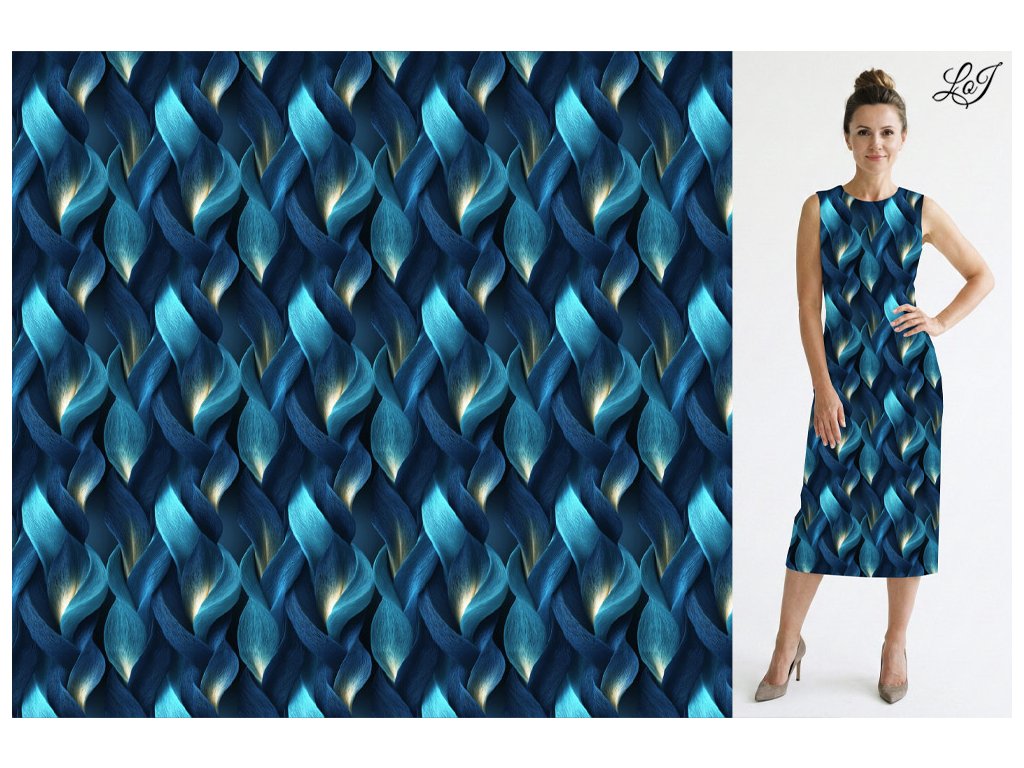 Digitálně tištěný bavlněný úplet s motivem modrého labyrintu. 94% bavlna, 6% elastan, gramáž 180 g/m², šíře 178 cm, OEKO-TEX certifikát.