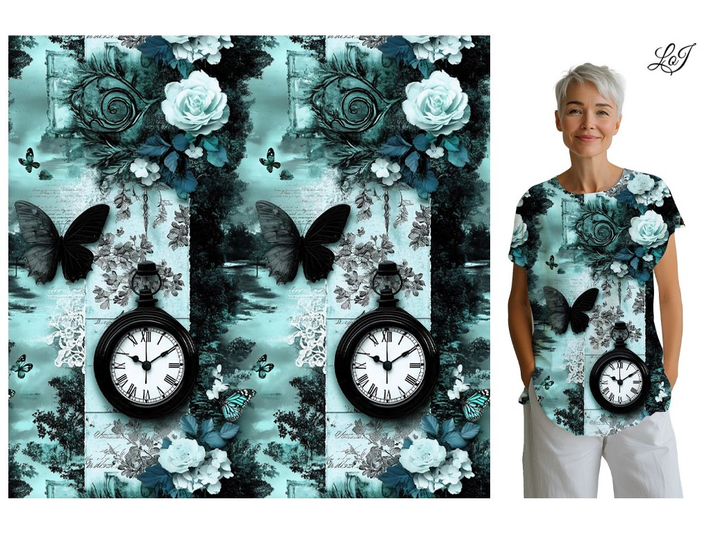 N.SKLADEM BŘEZEN - Bavlněný úplet TOP 180g - Zelenkavá s hodinami