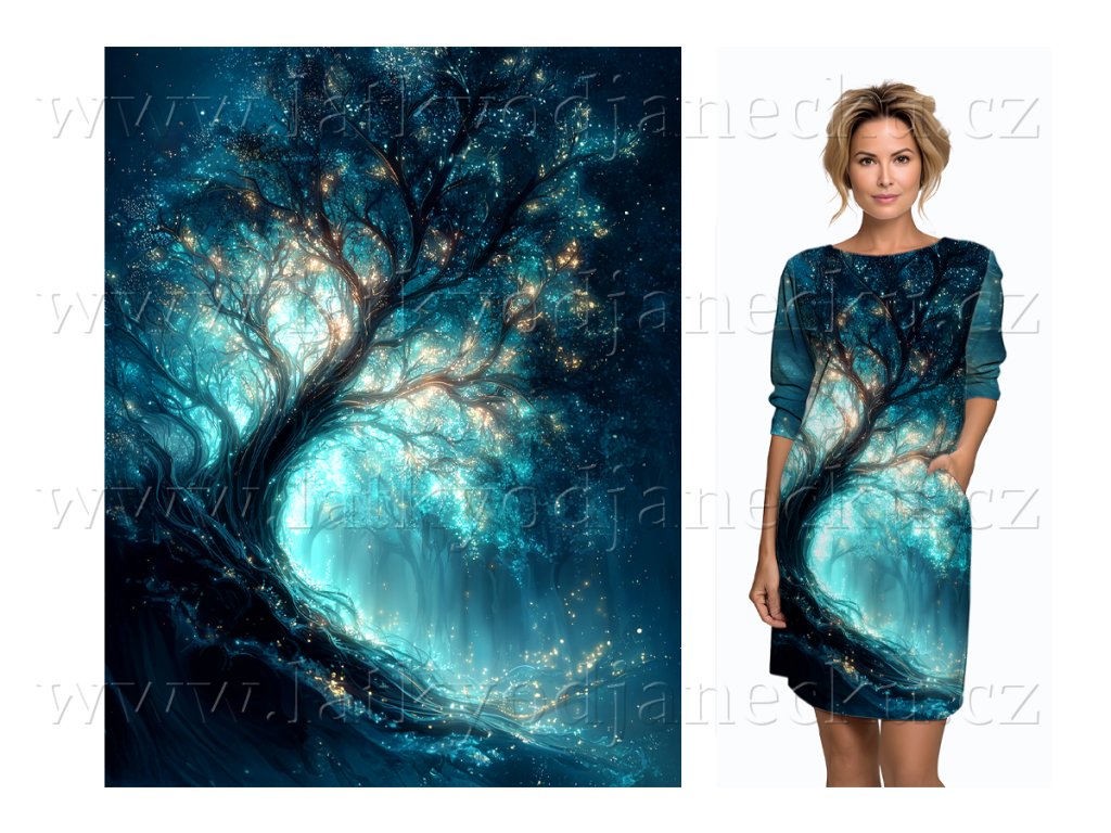 SKLADEM 11/1 - Ferra 260g - PANEL na šaty/tuniku na přední díl 100 cm - Modrá záře strom