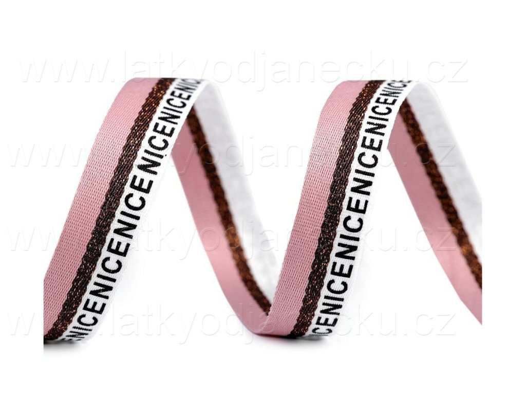 Lampas s pruhy a nápisem Nice stylově dozdobí vaše oděvy. Ve středu je ozdobený lesklým lurexovým proužkem. Lampas je jednostranný, pevný.
