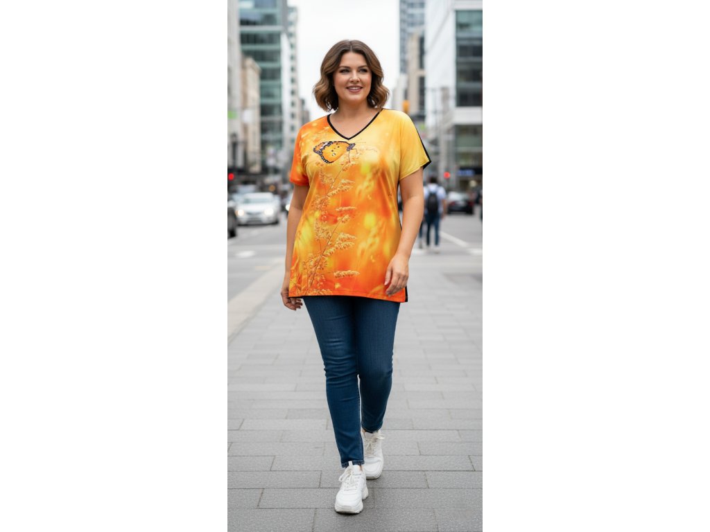 Halena má polopřiléhavý střih a elegantní V-výstřih, který opticky prodlužuje krk. Kimono rukávy zajišťují komfort i v teplých dnech.