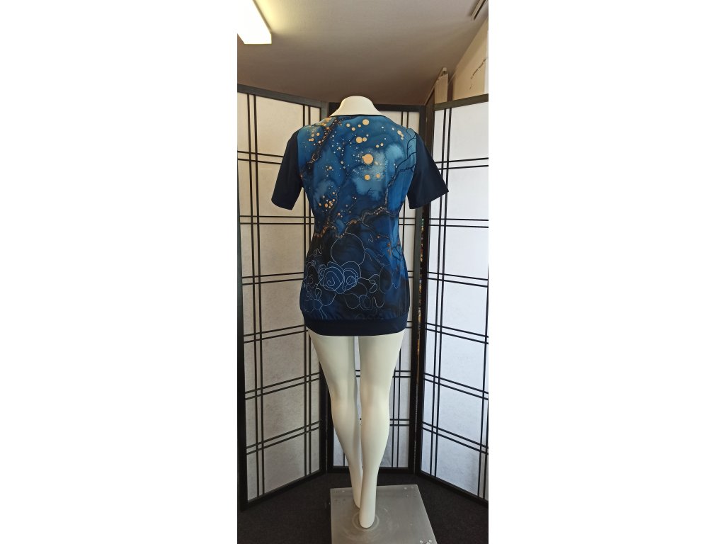 Halena má polopřiléhavý střih, krátké vsazené rukávy, elegantní V-výstřih, který podtrhuje ženskost. Spodní délka je zakončená do lemu. Lem výstřihu, spodní lem a rukávy jsou z jednobarevné doplňkové látky.