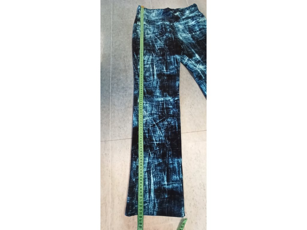 Kalhoty s rovnými nohavicemi. V pase guma. Vysoký pásek má mírně stahovací efekt přes bříško. Kalhoty těsně obepínají stehna, zadeček a boky, díky tomu mají mírně stahovací efekt. Od kolen jsou nohavice rovné.