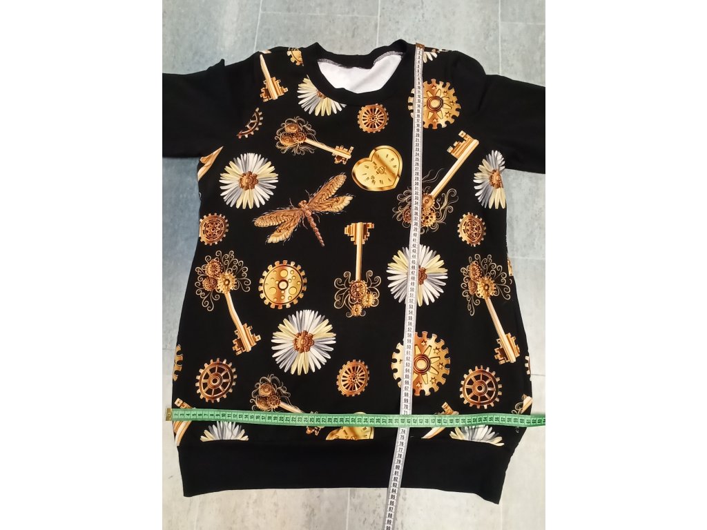 Tato mikina se vyznačuje polopřiléhavým, prodlouženým střihem, který se pohodlně přizpůsobí postavě. Výstřih klasický kulatý, délka je zakončena do lemu. Rukávy jsou dlouhé a zakončené nápletem, který je stejně jako délka a výstřih v černé barvě.
