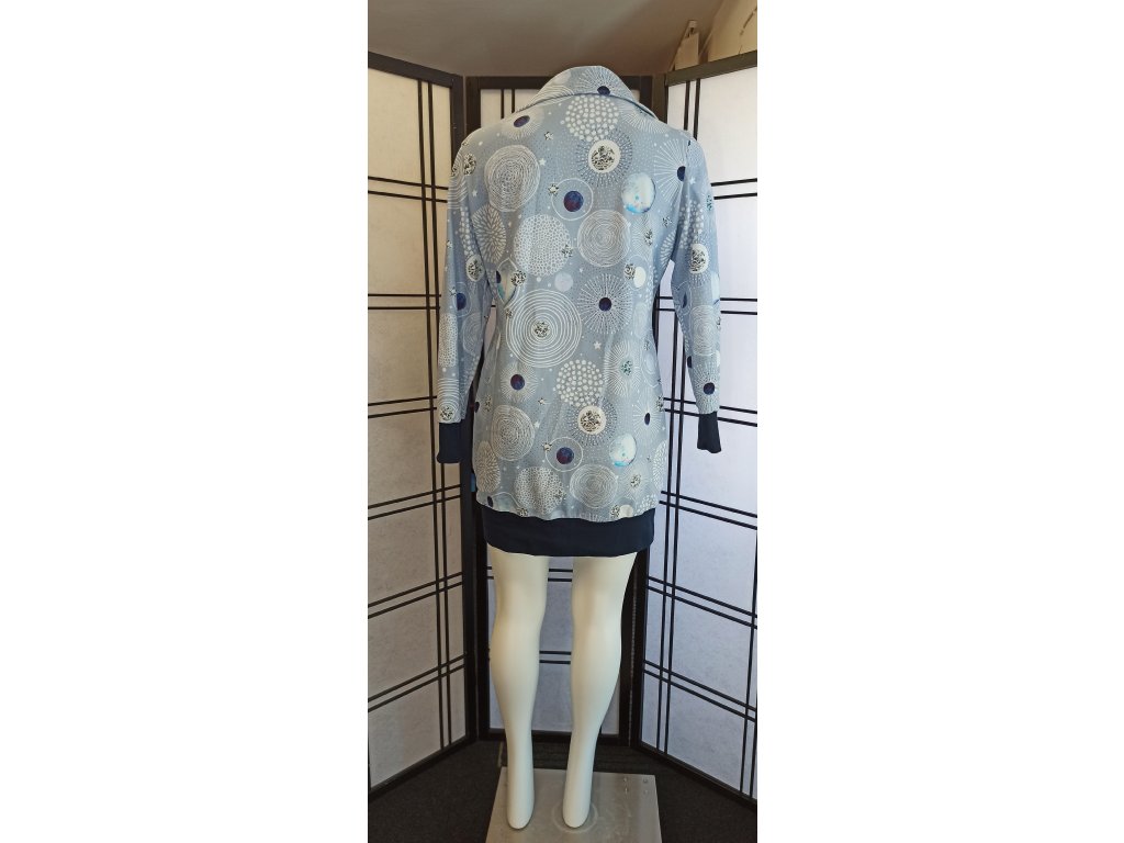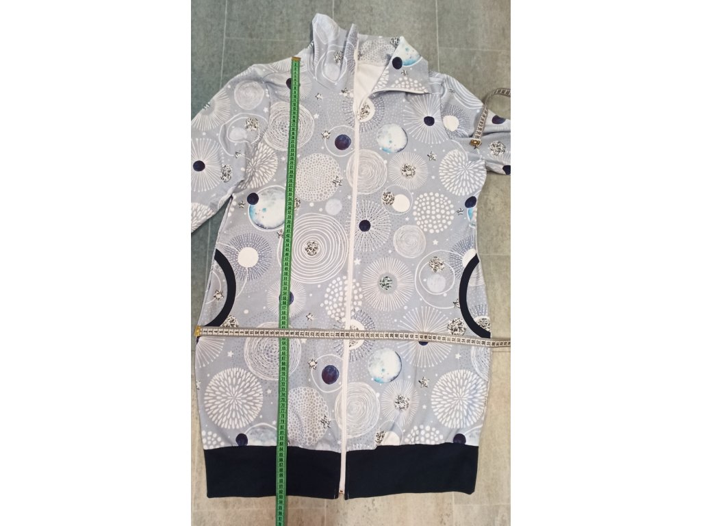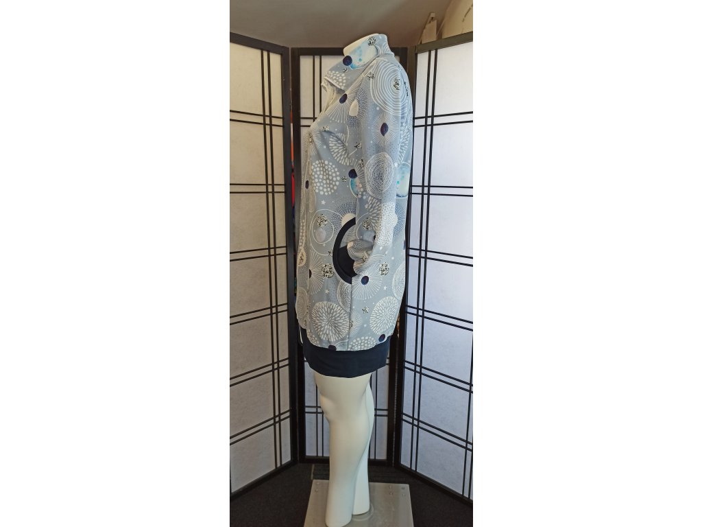 Tato mikina se vyznačuje polpřiléhavým, prodlouženým střihem, který se pohodlně přizpůsobí postavě. Délka je zakončena do lemu v tmavě modré barvě. Mikina má přední zip a stojáček, který jí dodává elegantní a moderní vzhled. Rukávy jsou dlouhé a zakončené širokými tmavě modrými manžetami. Na bocích jsou praktické kapsy, které jsou lemovány tmavě modrou barvou.