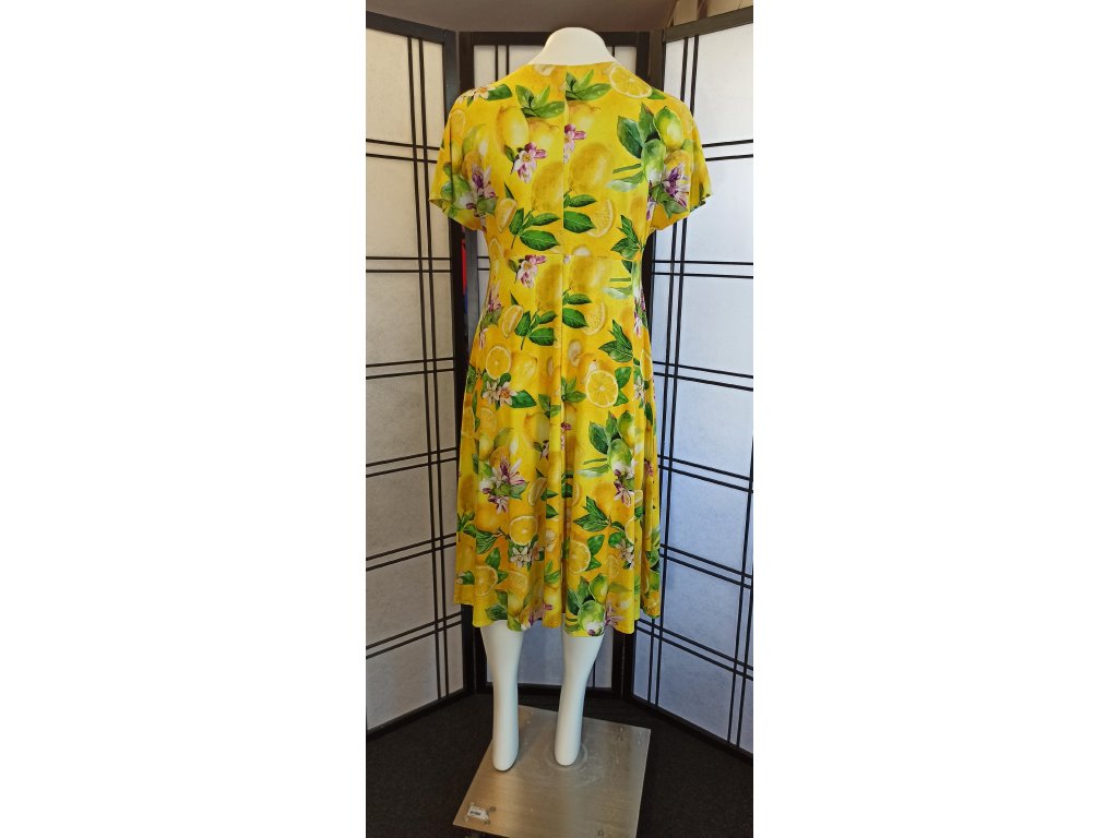 Horní díl šatů má hlubší výstřih do V, což zvýrazňuje dekolt a opticky zužuje pas. V pase je šev, který odděluje živůtek od sukně. Střih je v horní části přiléhavý a směrem dolů přechází do mírně rozšířené a splývavé sukně, což zajišťuje pohodlí a lichotivý vzhled. Krátké kimono rukávy dodávají šatům lehkost a vzdušnost.