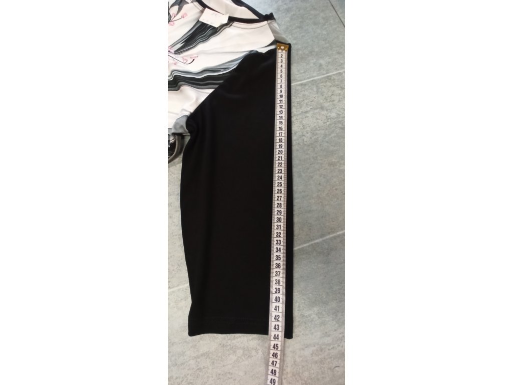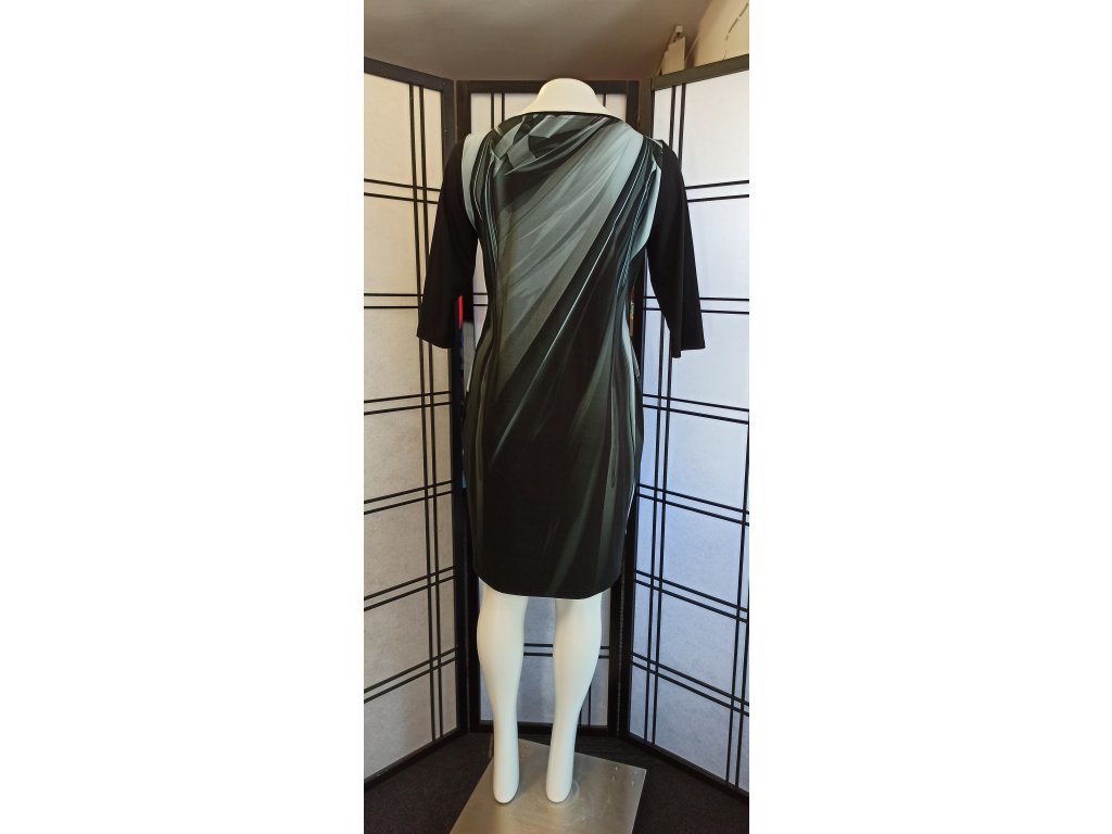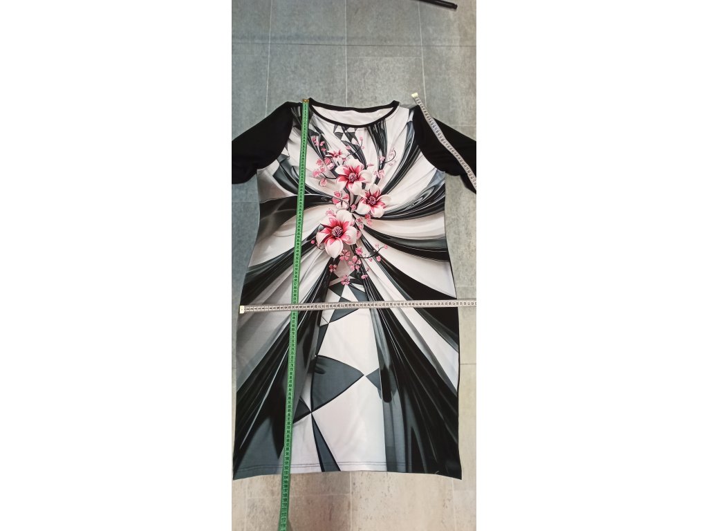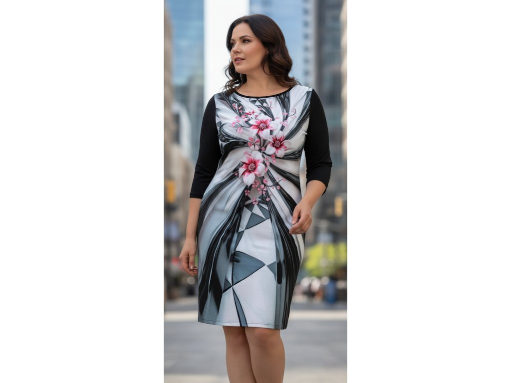 Šaty mají polopřiléhavý střih, který krásně zdůrazňuje siluetu. Klasický kulatý výstřih je jednoduchý a elegantní. Rukávy jsou tříčtvrteční a v jednolité černé barvě, což vytváří krásný kontrast s potiskem na těle šatů.