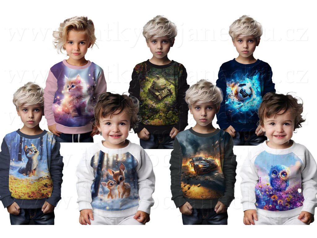 Mikina a obrázkem na předním díle, je doplněné jednobarevnou teplákovinou na zádech a rukávech. Lemy jsou z nápletu. Šijeme z panelu S, ale můžete si vybrat i panel M.