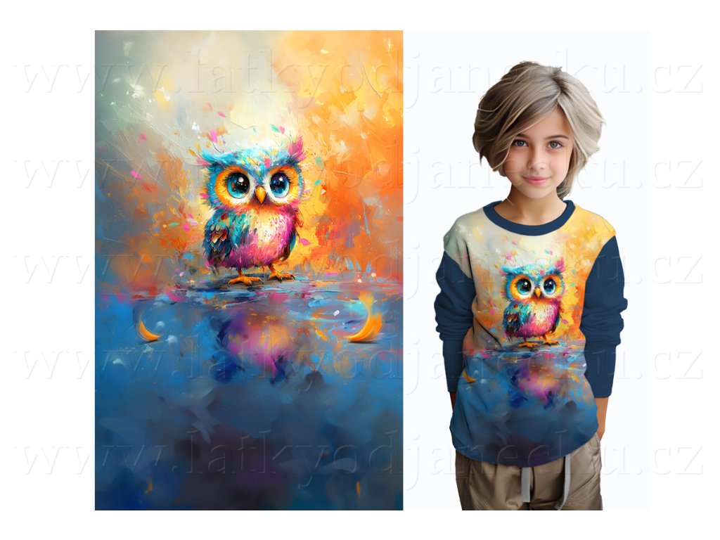 Panel je určen na přední díl. Na panel se vejde střih cca do velikosti 140 - na štíhlejší děti. (Pro jistotu si vždy změřte šířku předního dílu vašeho střihu - panel má na šířku 42,5 cm. Na zadní díl a rukávy je potřeba dokoupit látku - stačí vždy délka panelu. Např, k tomuto panelu - 70 cm.