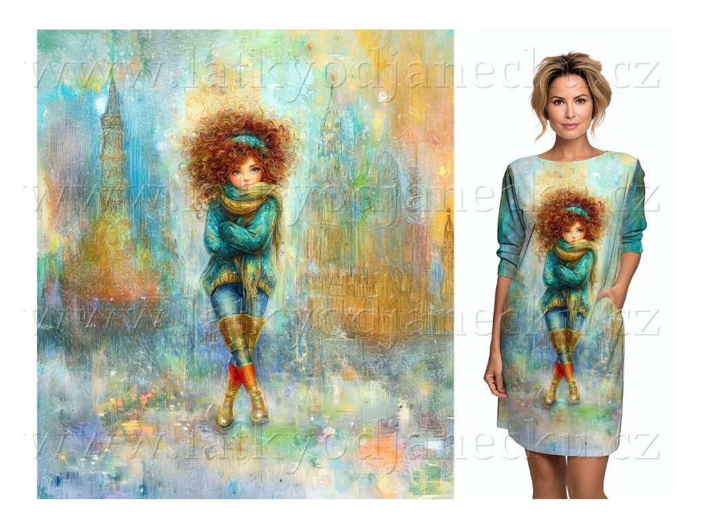 SKLADEM 11/2 - Teplákovina 240g - PANEL na přední díl mikinošatů XL 100 cm - Barvy duhy, dívka v šále