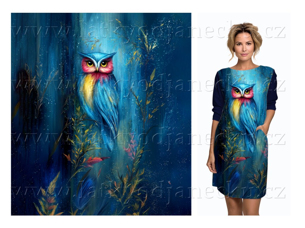 SKLADEM 11/1 - Teplákovina 240g - PANEL na přední díl mikinošatů 100 cm - Sova na modré