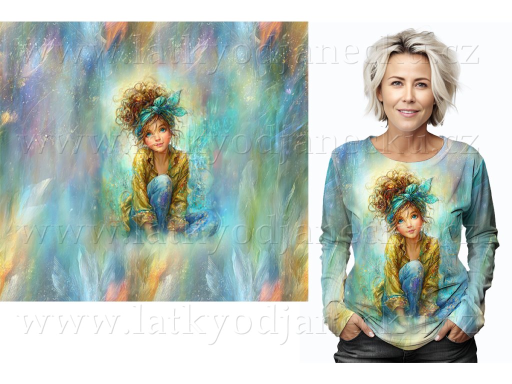 SKLADEM 11/2 - Teplákovina 240g - PANEL na přední díl mikiny XL 80 cm - Barvy duhy, sedící dívka
