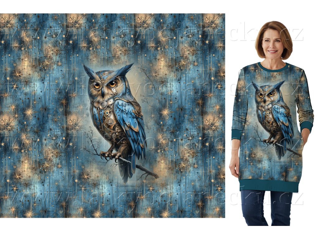 Teplákovina 240g - PANEL na přední díl XL 80 cm - Steampunk Sova na větvi